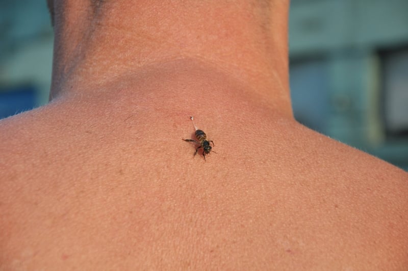 Intepatura de Albine - Miere SabadusDupa cum stim, in majoritatea cazurilor albina isi lasa acul infipt dupa ce inteapa, impreuna cu punga de venin si pleaca.