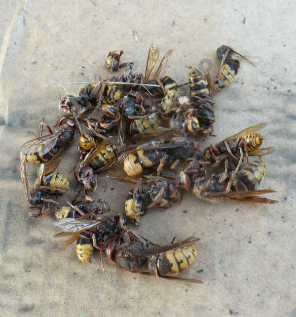 Duminica a fost ultima zi de stationare la padure.Sub asteptari. Acesta este cuvantul cel mai realist si mai simplu. Din 3 saptamani, a fost o singura zi in care nu am avut parte de ploi. In rest, zilnic ploi. Dupa atatea ploi, mai aveau putin si zalauanii (SJ), incepeau sa-si faca griji cu mutatul :). Binenteles, ca de obicei, pe langa ploi si-au facut datoria foarte bine si viespii, care au ajutat la reducerea albinelor din familii. Ceea ce vedeti, sunt doar o parte din criminali, care apropiindu-se de pavilion, au fost omorati de catre tata socru. Sunt foarte mari, aproape cat o baterie A6 si foarte rezistenti la lovituri.